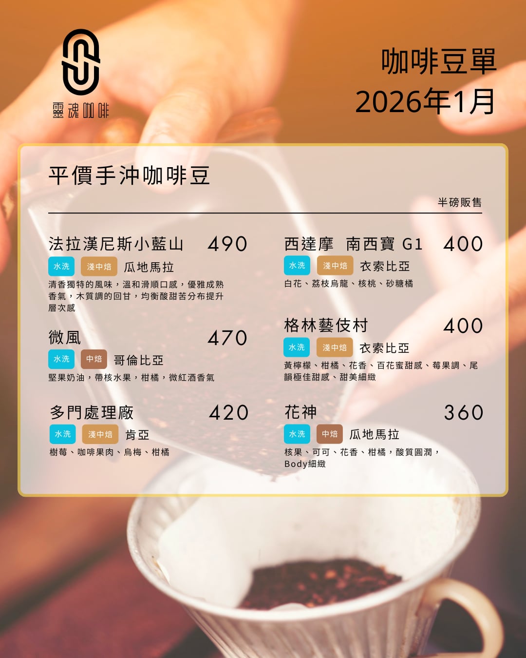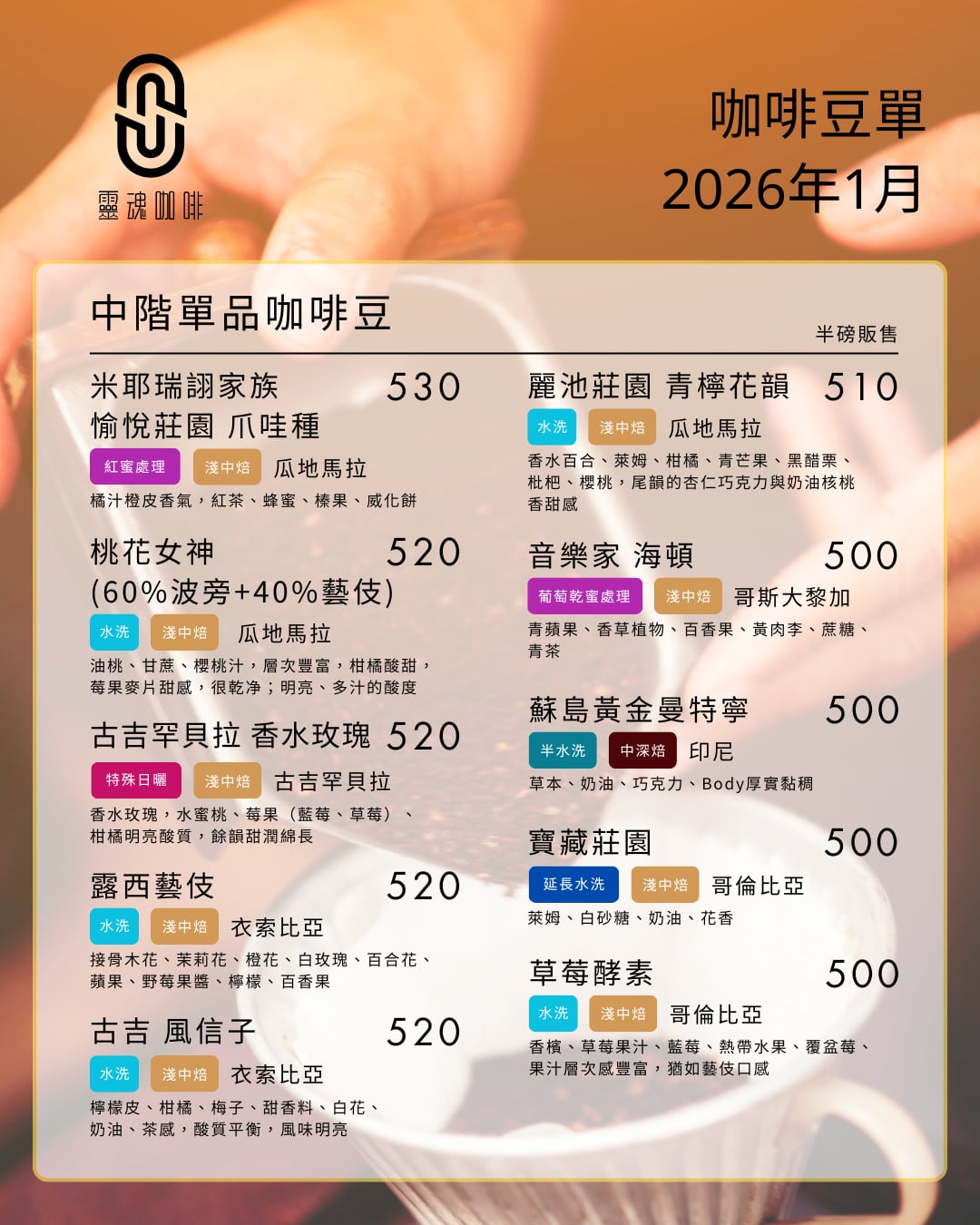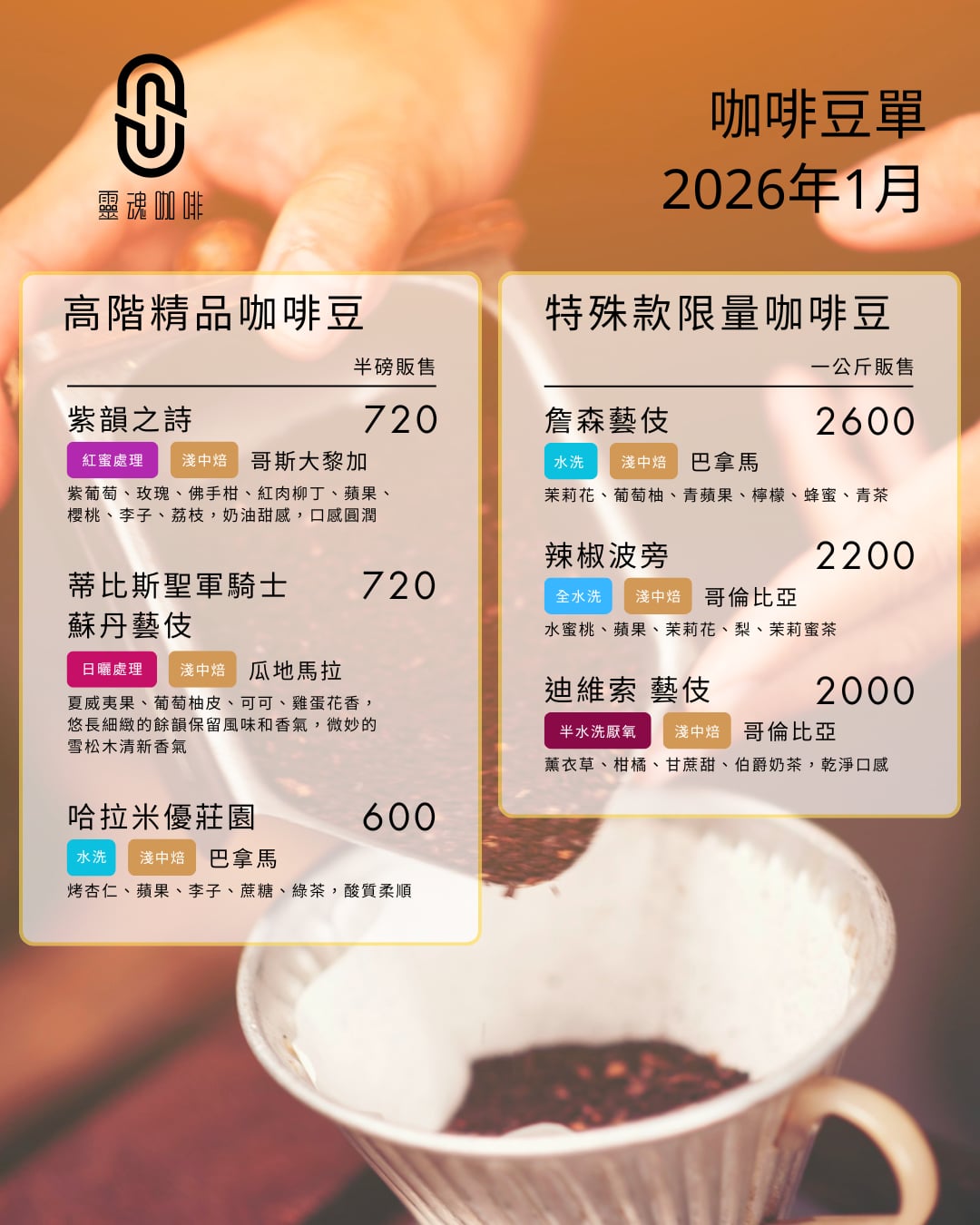 #靈魂咖啡 #SoulCoffee #2026咖啡豆單 #自家烘焙 #藝伎咖啡 #詹森藝伎 #辣椒波旁 #紫韻之詩 #草莓酵素 #黃金曼特寧 #手沖咖啡 #台北咖啡 #咖啡日常
